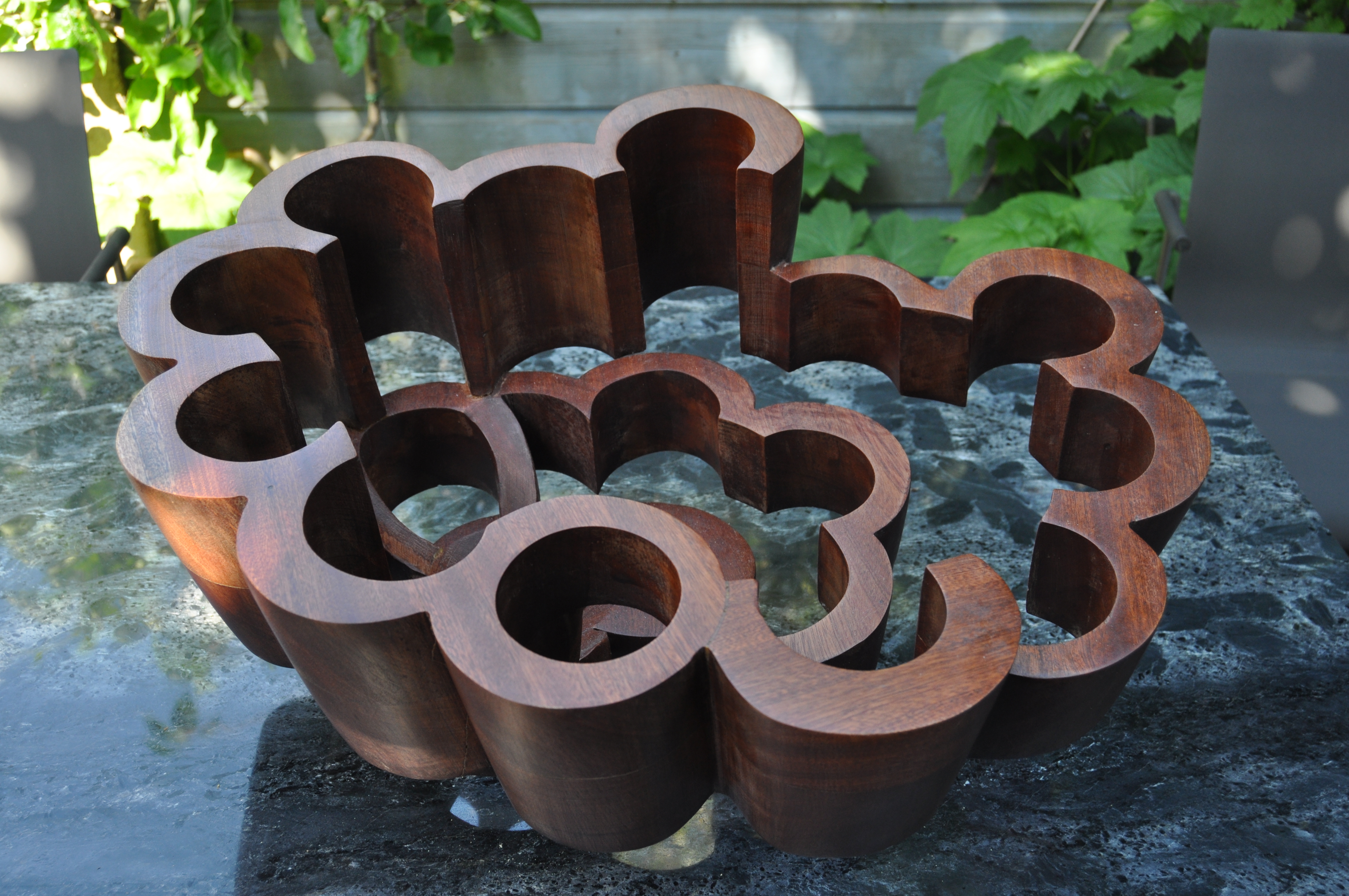 Nimbus is opgebouwd uit drie lagen Sipo mahonie. De ronde vormen zijn conisch uitgezaagd onder een hoek van 72,5 graden.