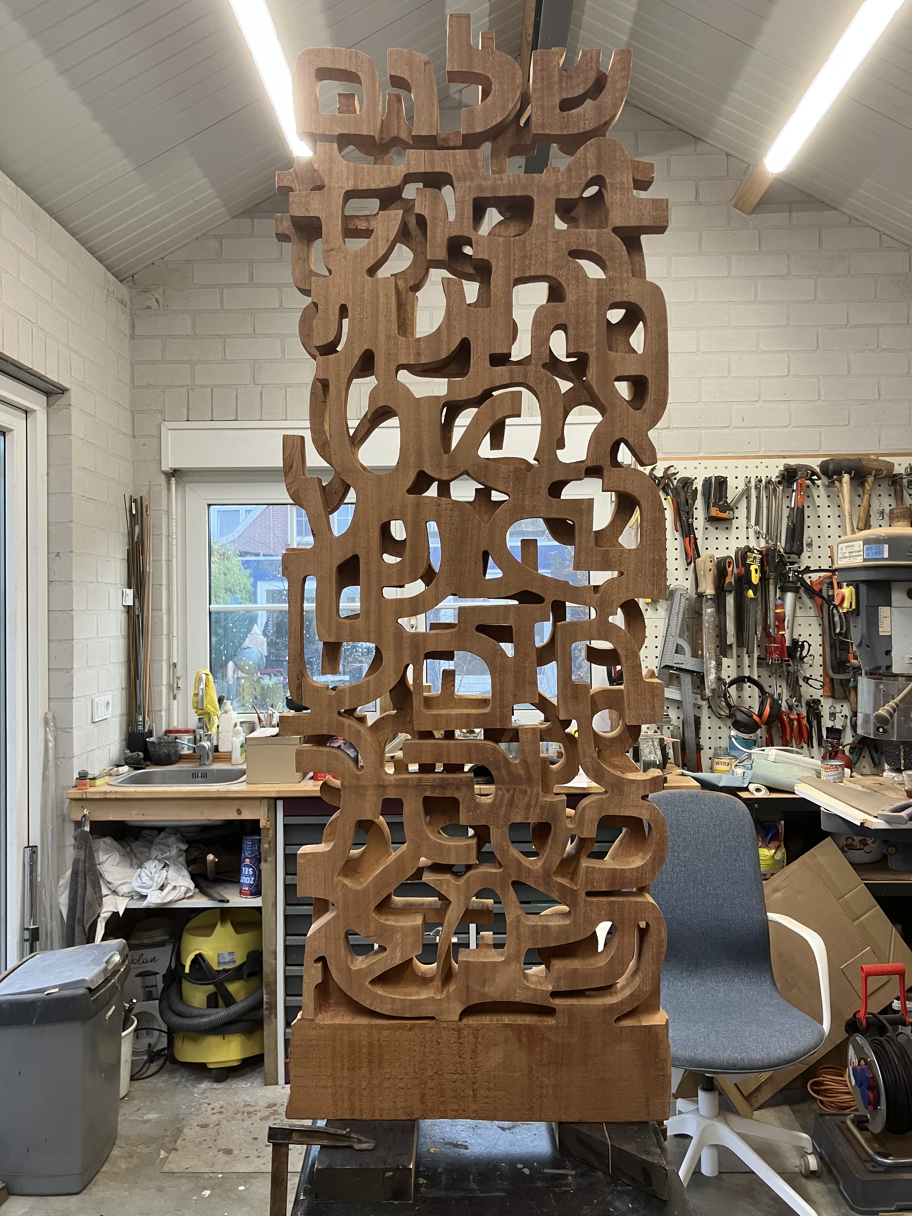 Dit beeld heeft twee kanten. Een met Arabische tekst en de andere kant in Hebreeuws. Uitgangspunt zijn de woorden: vrede, samen, verbinding en het spijt me.
